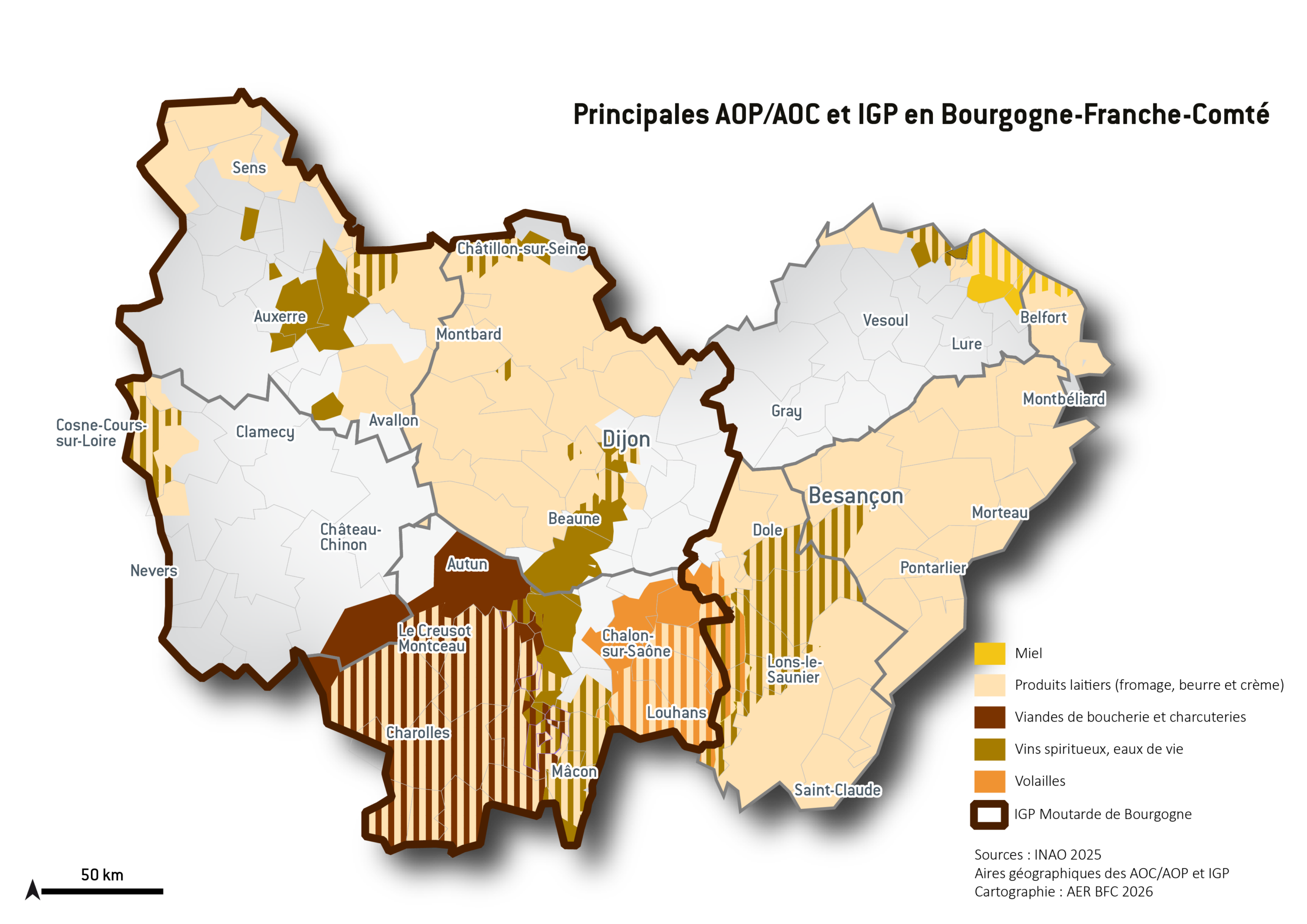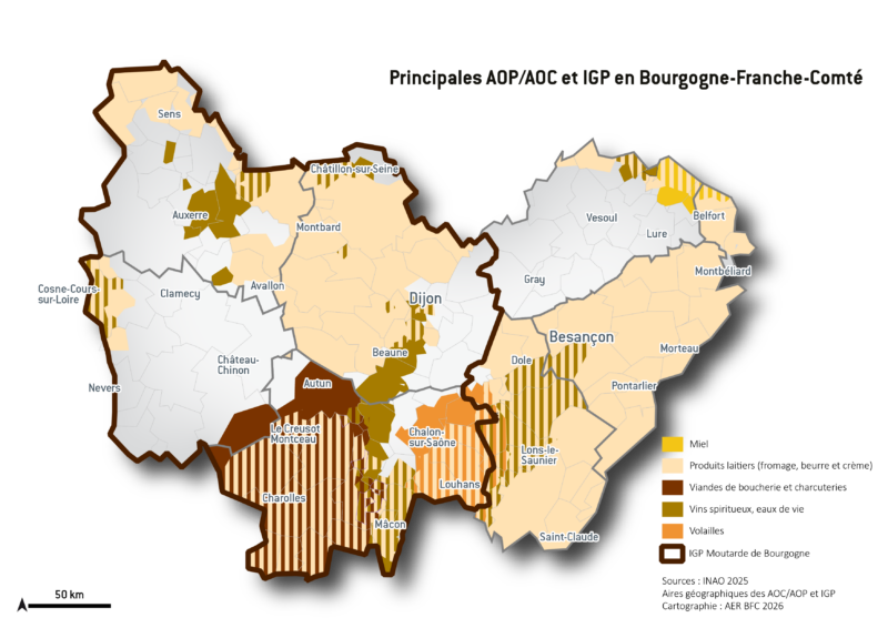La Bourgogne-Franche-Comté se distingue par la richesse et la reconnaissance de ses productions, avec 140 AOC/AOP/IGP :